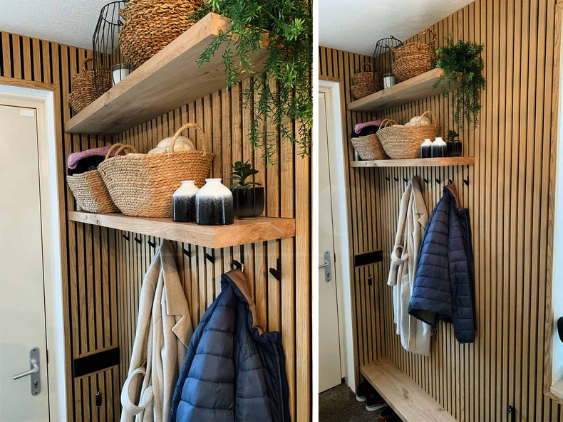 In een hal met weinig daglicht werken lichte tinten het best: Rustiek Eiken en Natuurlijk Eiken houden de ruimte open. De lattenstructuur geeft diepte door schaduwwerking, waardoor de wand interessant blijft zonder de ruimte donkerder te maken dan hij al is.