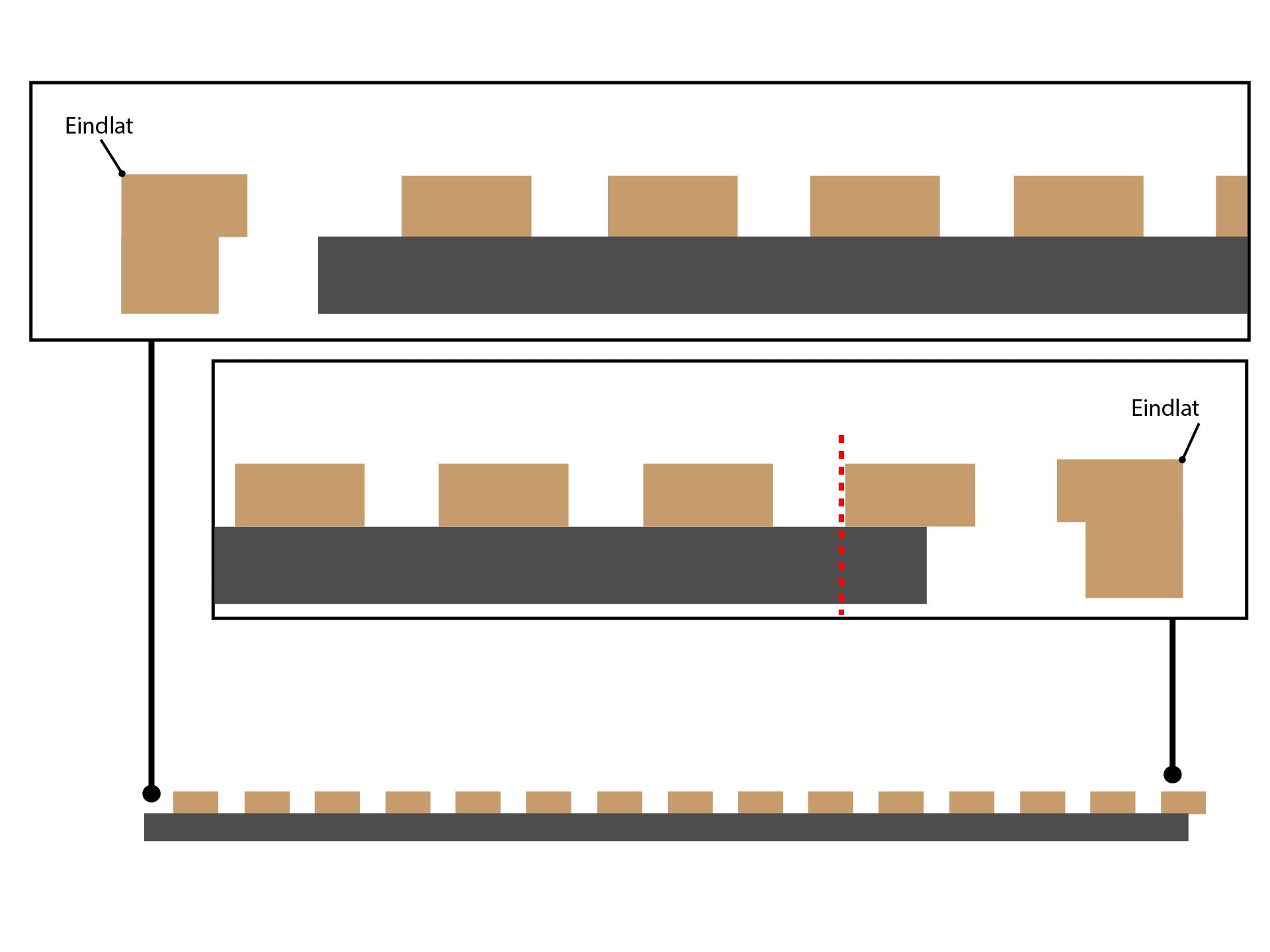 2. Voorbereiden bij de panelen: Zoals hiernaast is afgebeeld, kan de eindlat aan de kant van het uitstekende vilt, daar tegen aan gemonteerd worden. Voor de andere kant, snij de laatste lat weg, waardoor de eindlat tegen het vilt aan gemonteerd kan worden.